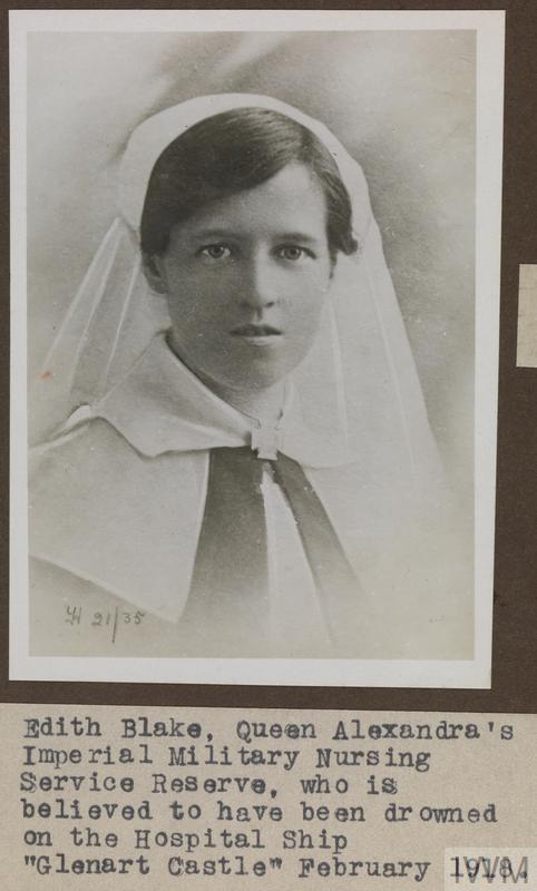 Edith Blake, Queen Alexandra's Imperial Military Nursing Service Reserve. Drowned on the Hospital Ship Glenart Castle 01 February 1918to 28 February 1918 .