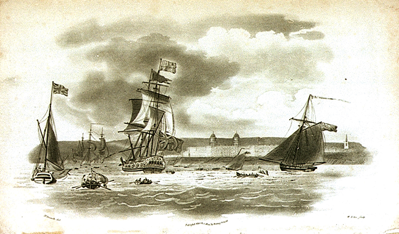 Greenwich Hospital in the distance and the 'Augusta' royal yacht , 5 April 1795. The fuller text description of this illustration for the 'Naval Chronicle' is 'View of the River Thames, with Greenwich Hospital in [the] distance an