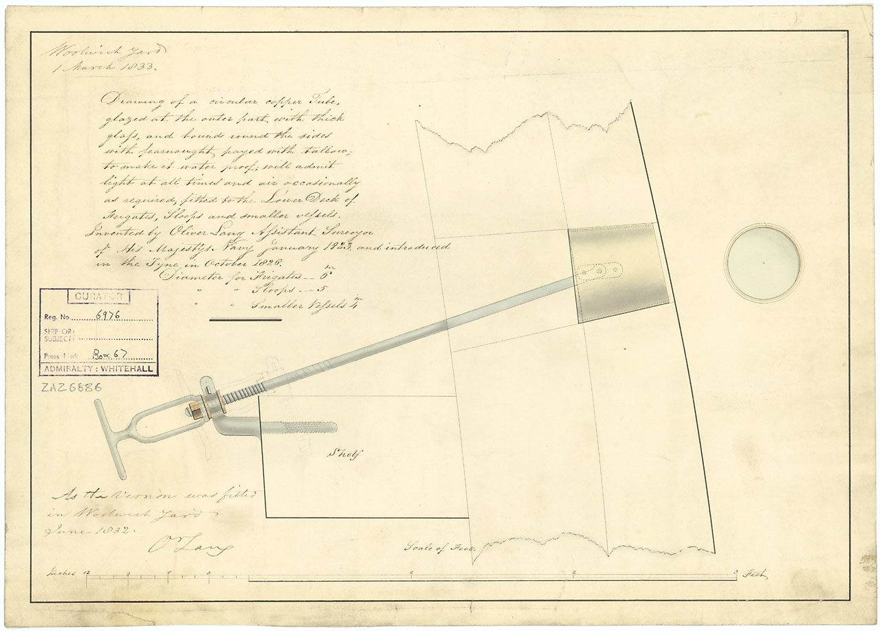 Scuttle fitting for Frigates, Sloops, and smaller vessels, specifically Tyne (1826) and Vernon (1832). Scale: 1:4.  Plan showing a part section illustrating the fitting of a scuttle to the Lower Decks of Frigates, Sloops and smaller vessels, as invented b