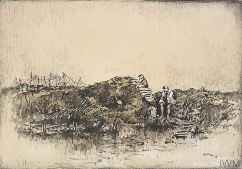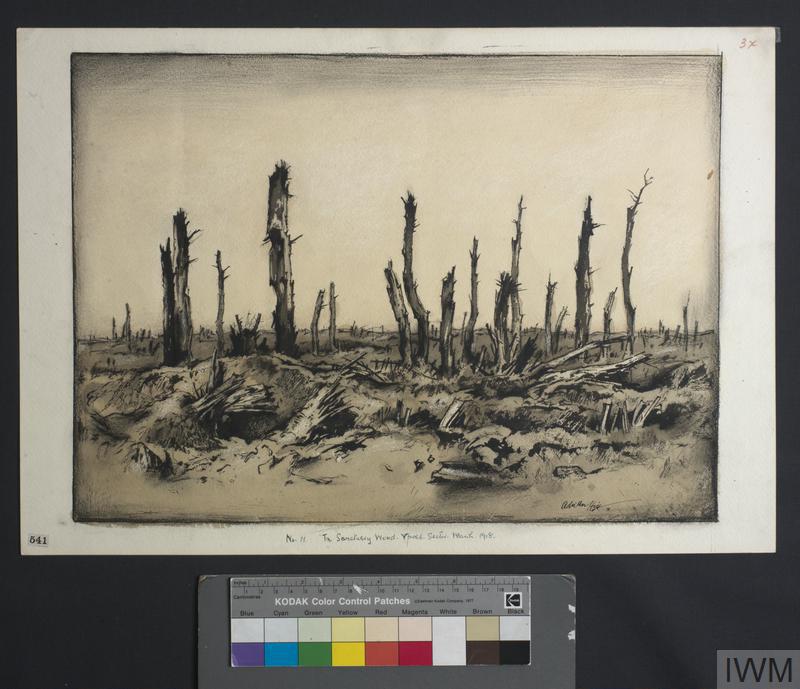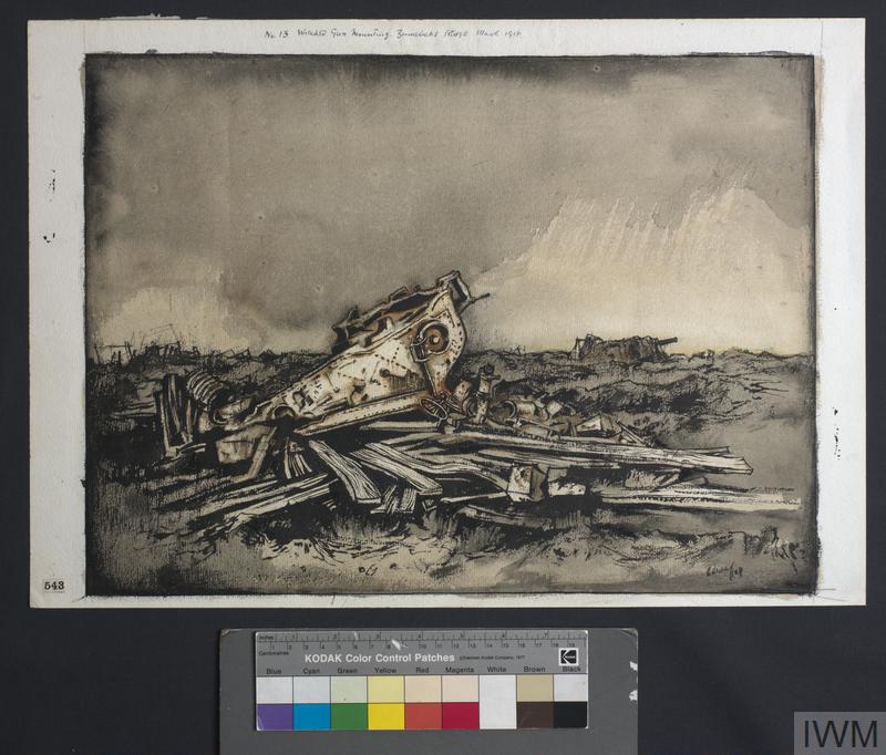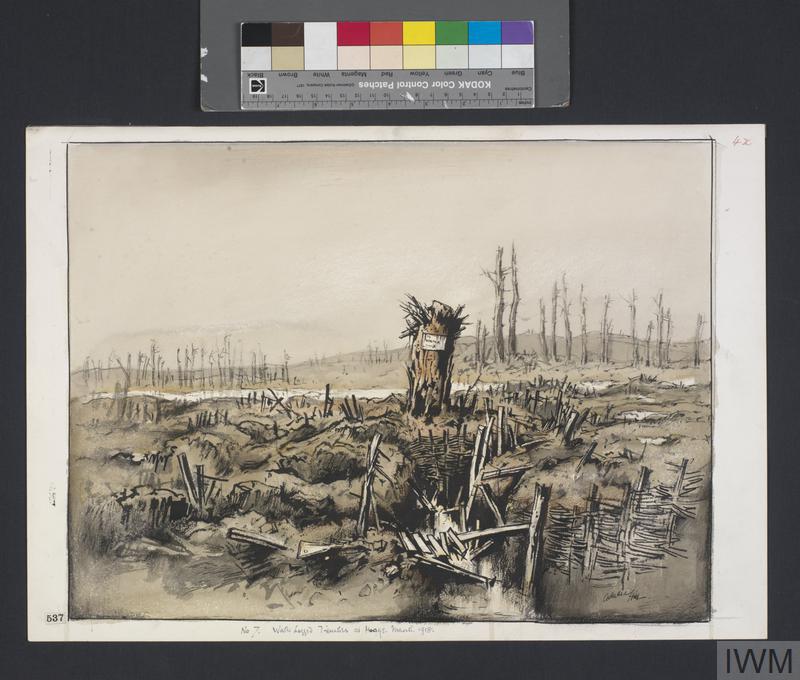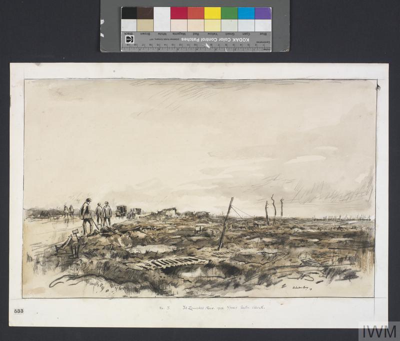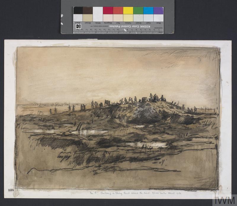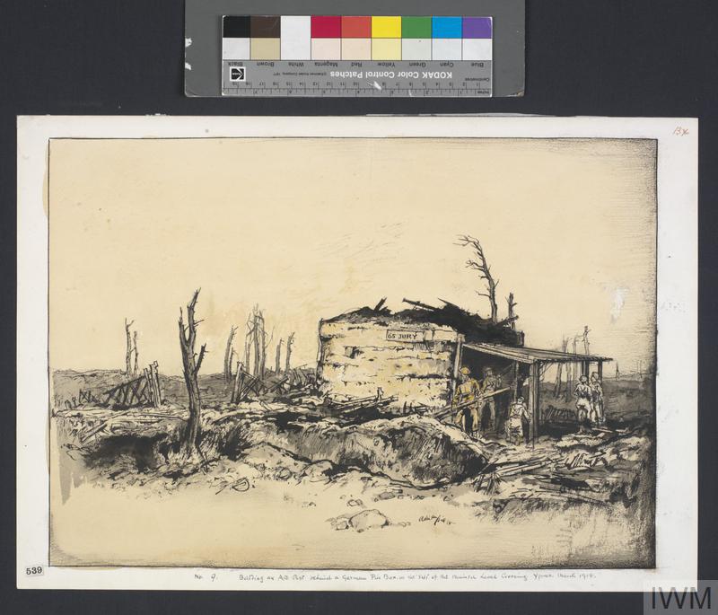 Building An Aid Post : behind a captured pill-box on the site of the ruined level-crossing, Ypres Sector, March 1918