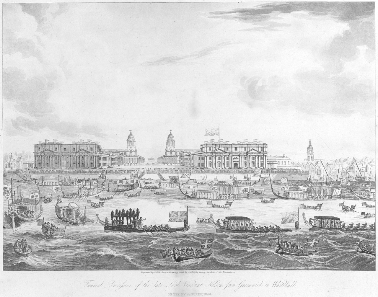 Funeral Procession of the late Lord Viscount Nelson, from Greenwich to Whitehall on the 8th January, 1806. Print. Funeral procession of Nelson from Greenwich to Whitehall, 8 January 1806. Many boats on the river and crowds on the bank as the procession l