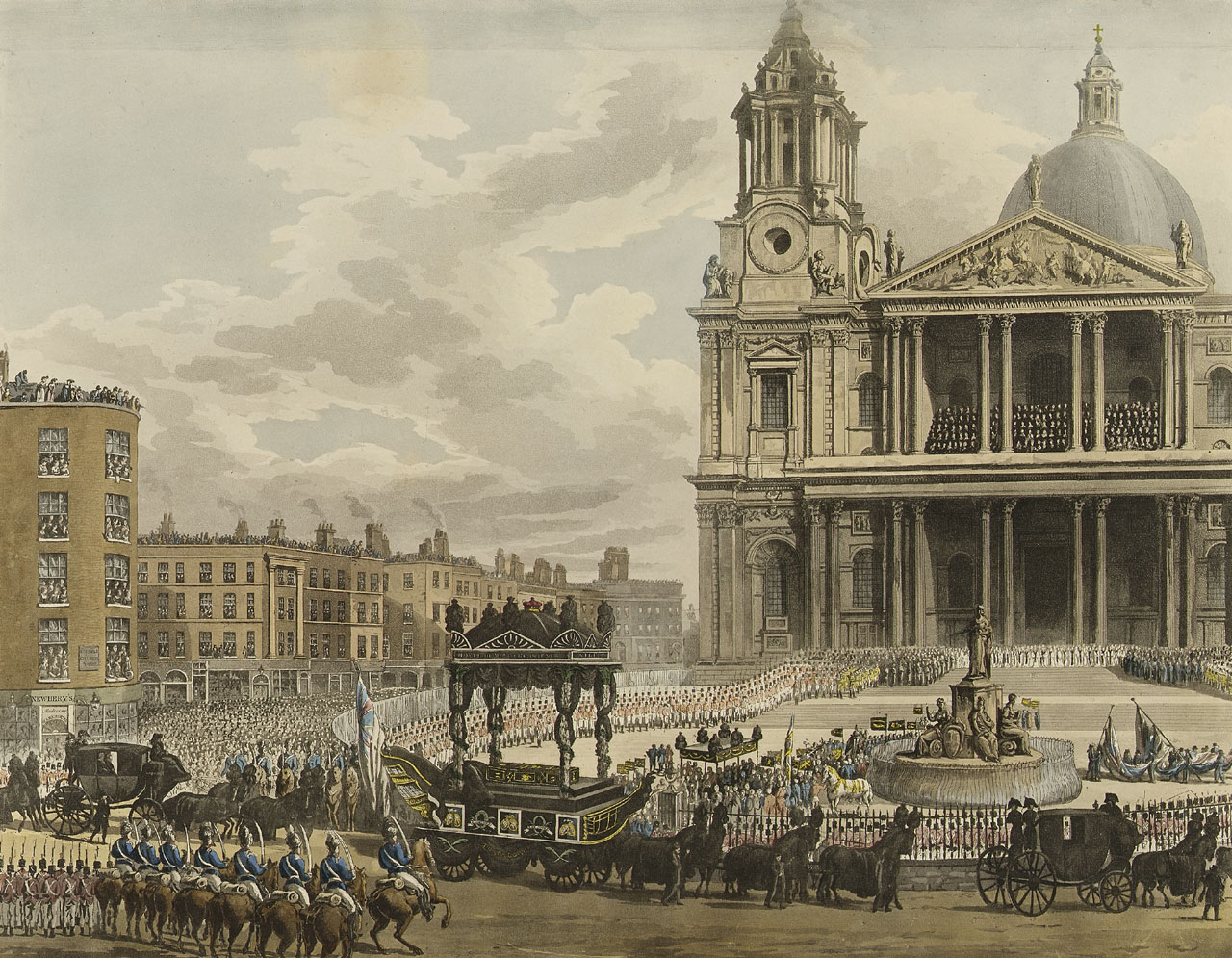 Funeral Procession of the late Lord Viscount Nelson, from the Admiralty to St Paul's, London, 9th January 1806. Hand-coloured. Nelson's funeral procession approaching St Paul's Cathedral with massed ranks of soldiers, sailors, clergy and cr