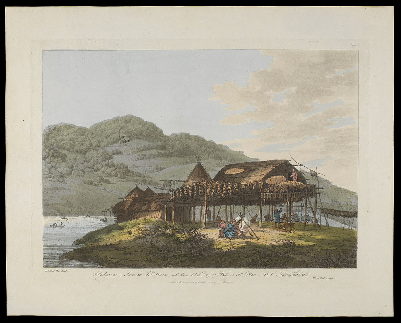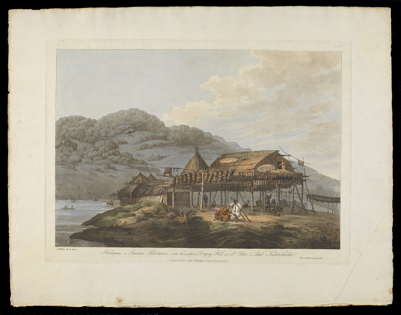 Views in the South Seas.... Balagans or Summer Habitations, with the method of Drying Fish at St Peter & Paul. Kamtschatka. Hand-coloured.; Text to plate on separate sheet.; Plate XI.