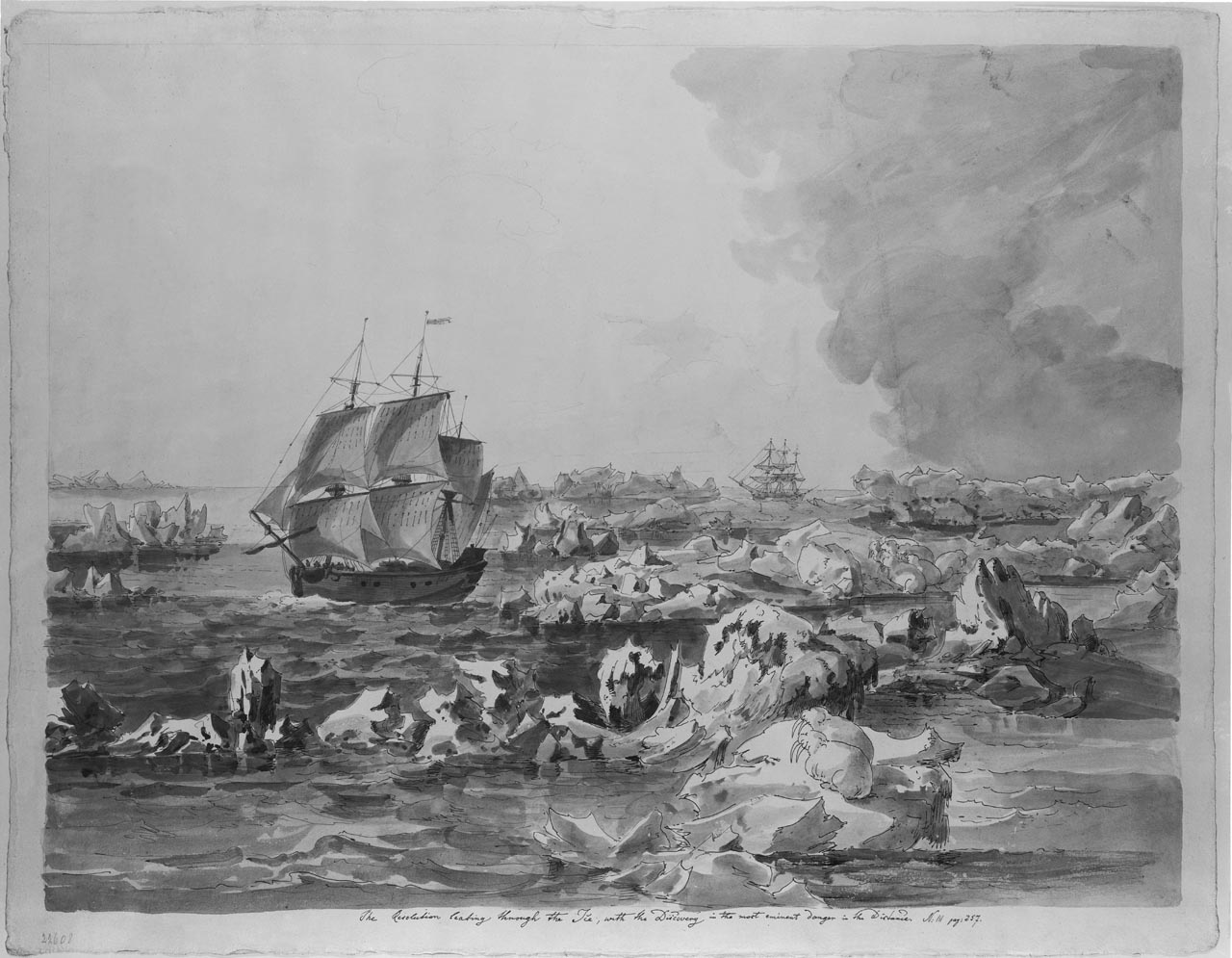 Views in the South Seas... The Resolution beating through the ice with the Discovery in the most eminent danger in the distance. Hand-coloured.; Text to plate on separate sheet.; Plate IX.
