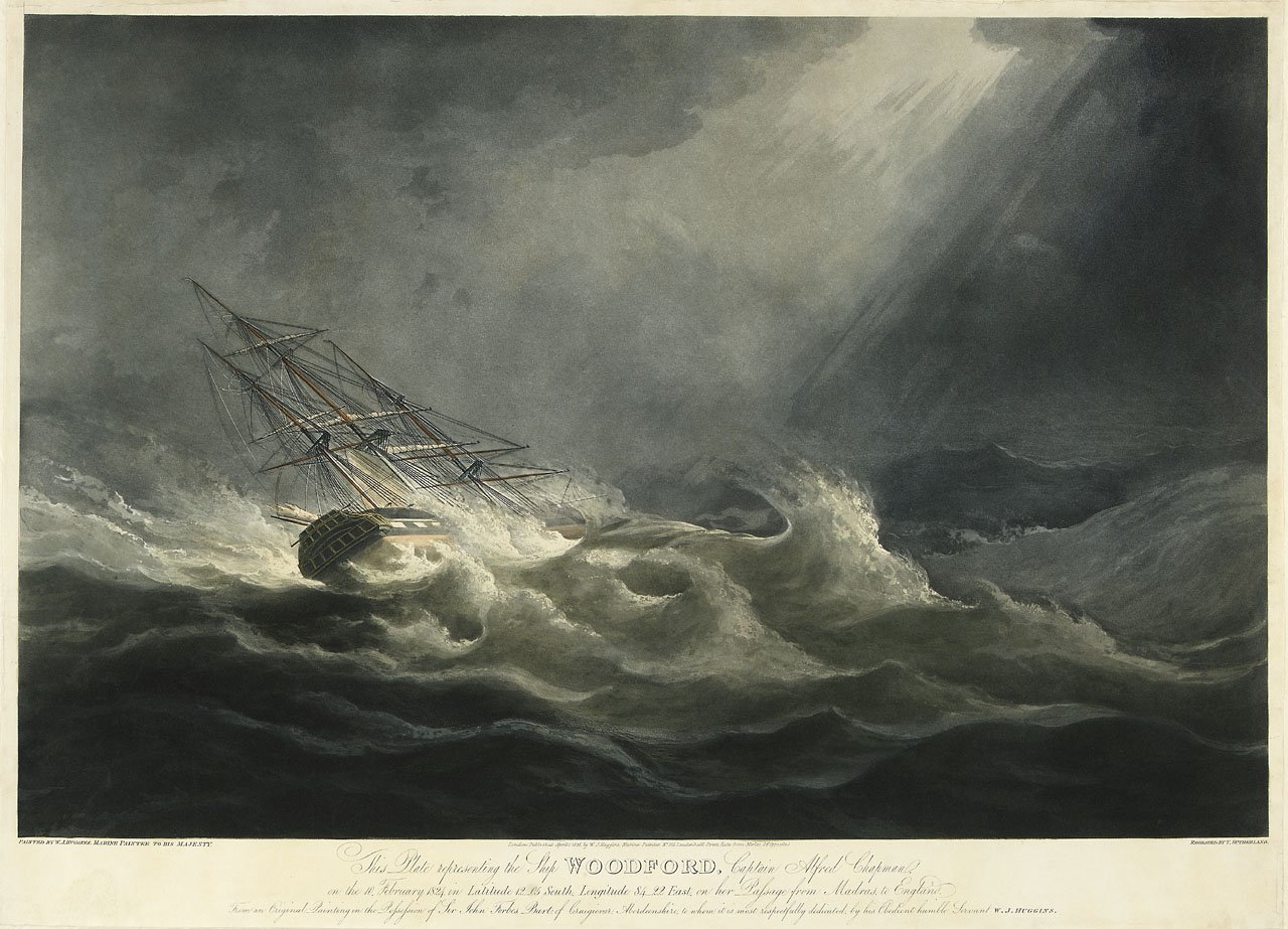 This Plate representing the Ship 'Woodford'... Captain Alfred Chapman... 1824... on her Passage from Madras to England (stern view). Print captioned 'This Plate representing the Ship ''Woodford''... Captain Alfred Chapma