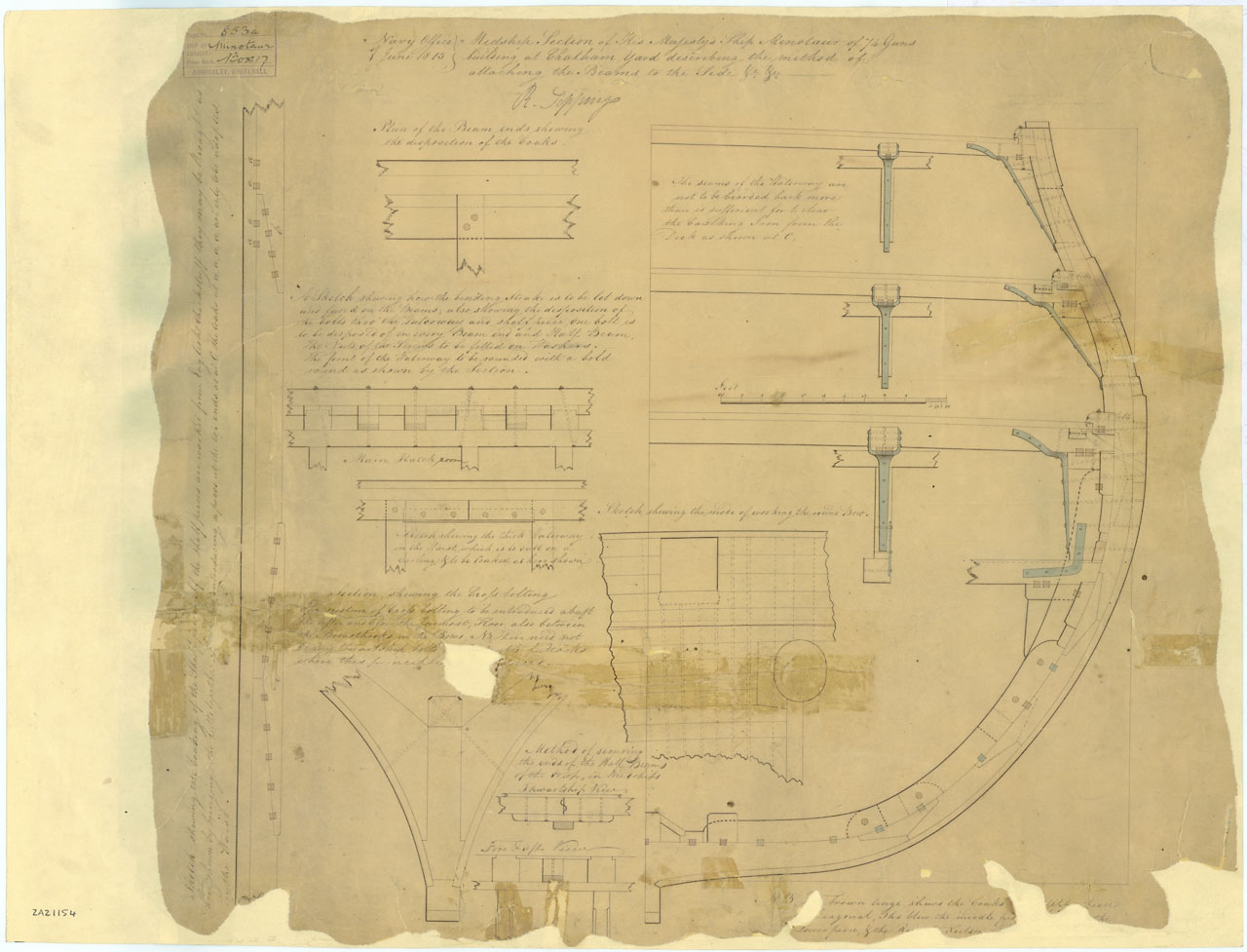 'Minotaur' (1816). Scale: 1:24. Plan showing the midship section with diagrams illustrating the method of attaching the beams to the sides for 'Minotaur' (1816), a 74-gun Third Rate, two-decker, as building at Chatham Dockyard.