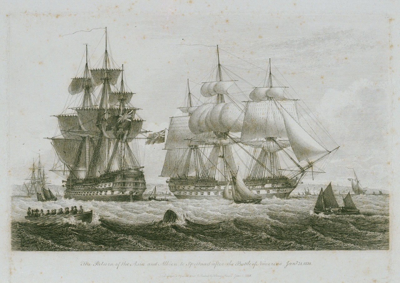The Return of the Asia and Albion to Spithead after the Battle of Navarino Jany 31. 1828. The veteran Napoleonic-era ships 'Asia' and 'Albion' are shown making their way back to Portsmouth after fighting in the Battle of Navarino, whic