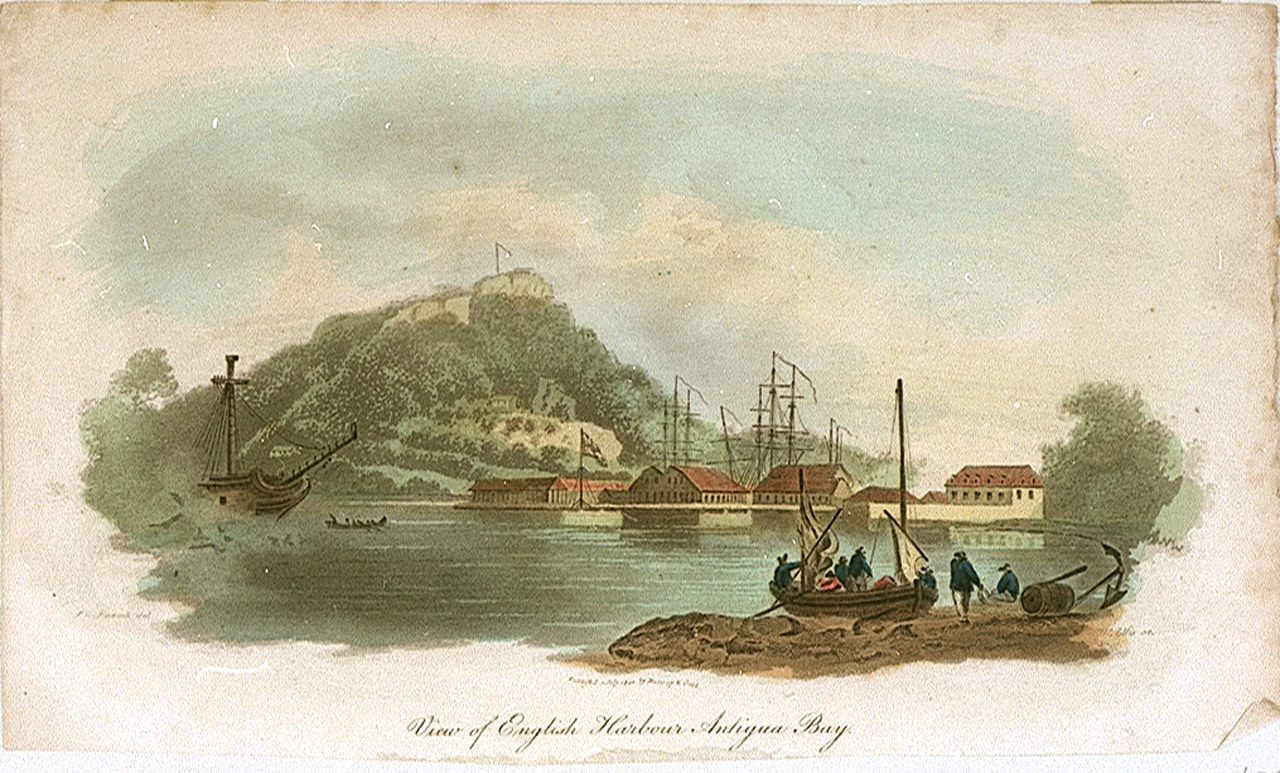 View of English Harbour, Antigua Bay. Vignette. From the 'Naval Chronicle' vol. III, f.p.469, plate 35. The plate was published uncoloured.
