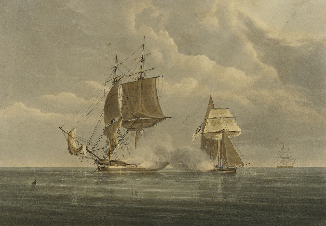 Second View of HM Sloop El Vincego I W Wright Esqr, Commander, taken in the Bay of Quiberon by Six Brigs & Eleven Gun Boats of the French, on the 8th of May 1804. Hand-coloured.