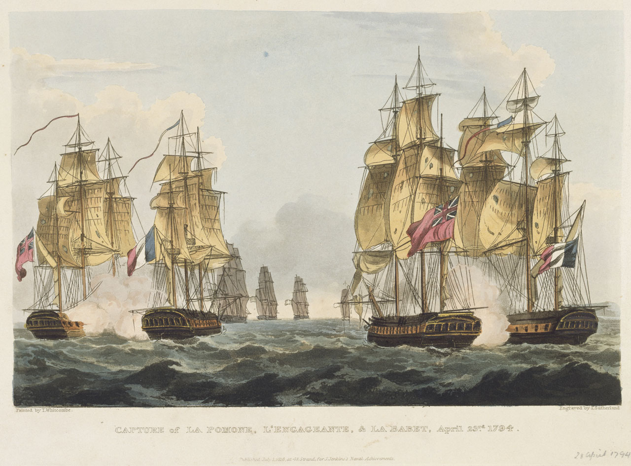 Capture of La Pomone L' Engageante & La Babet April 23rd 1794. Hand-coloured.