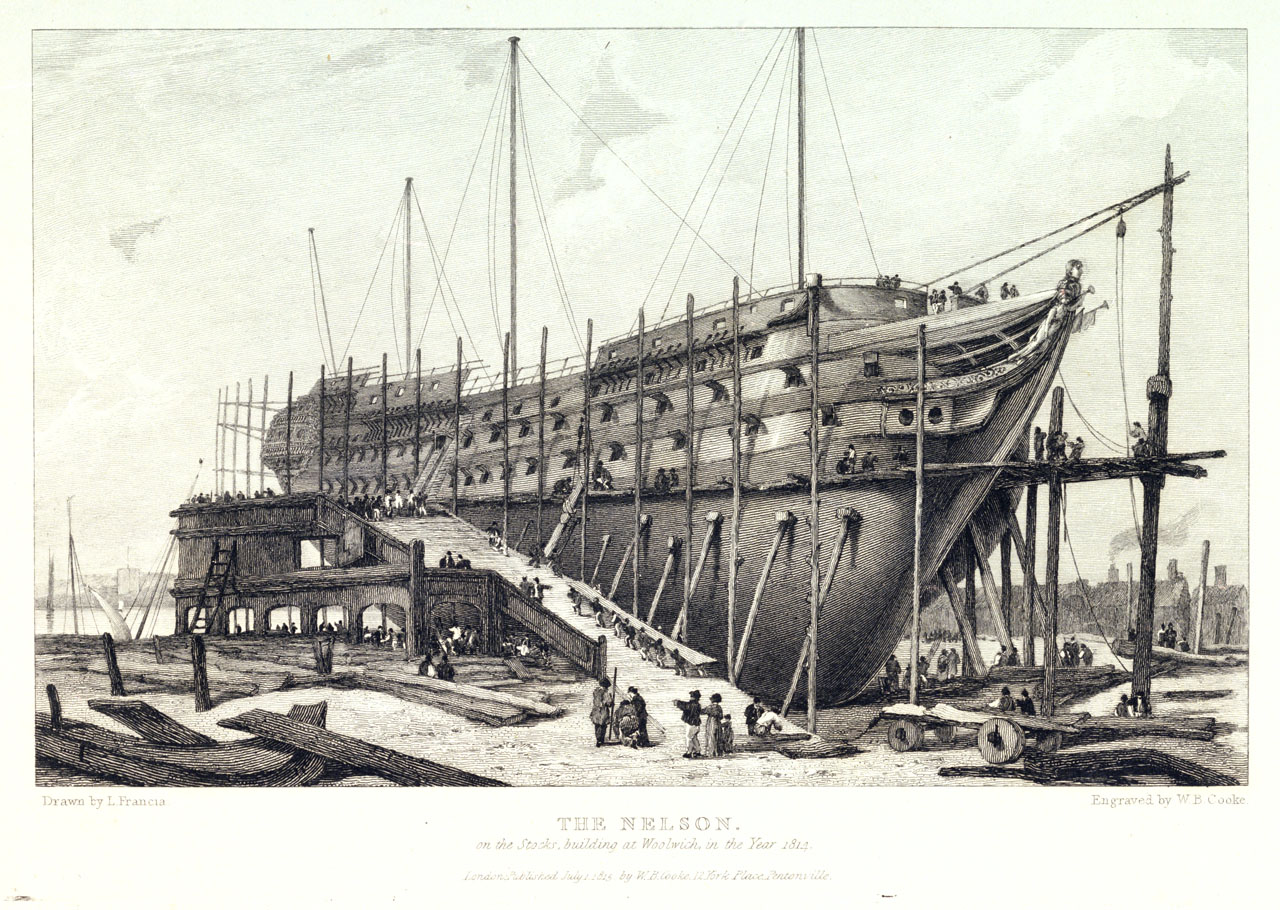 The Nelson on the Stocks, building at Woolwich in the Year 1814. Hand-coloured. During the Napoleonic War there was a huge expansion in shipbuilding at the Royal Dockyards on the Thames. The 'Nelson' - named after the hero of Trafalgar - was ju