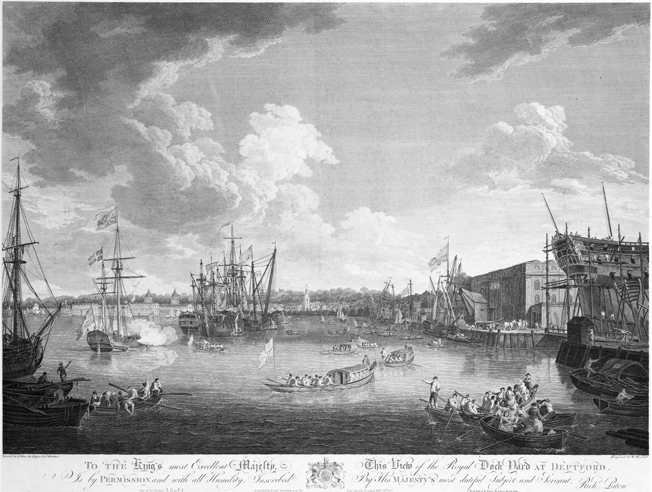 To the King's most Excellent Majesty, This View of the Royal Dock Yard at Deptford... Richd. Paton. Print from the oil painting by Paton, now in the Royal Collection (RCIN405164). It is one of a set of which the other oil originals are also in the Ro