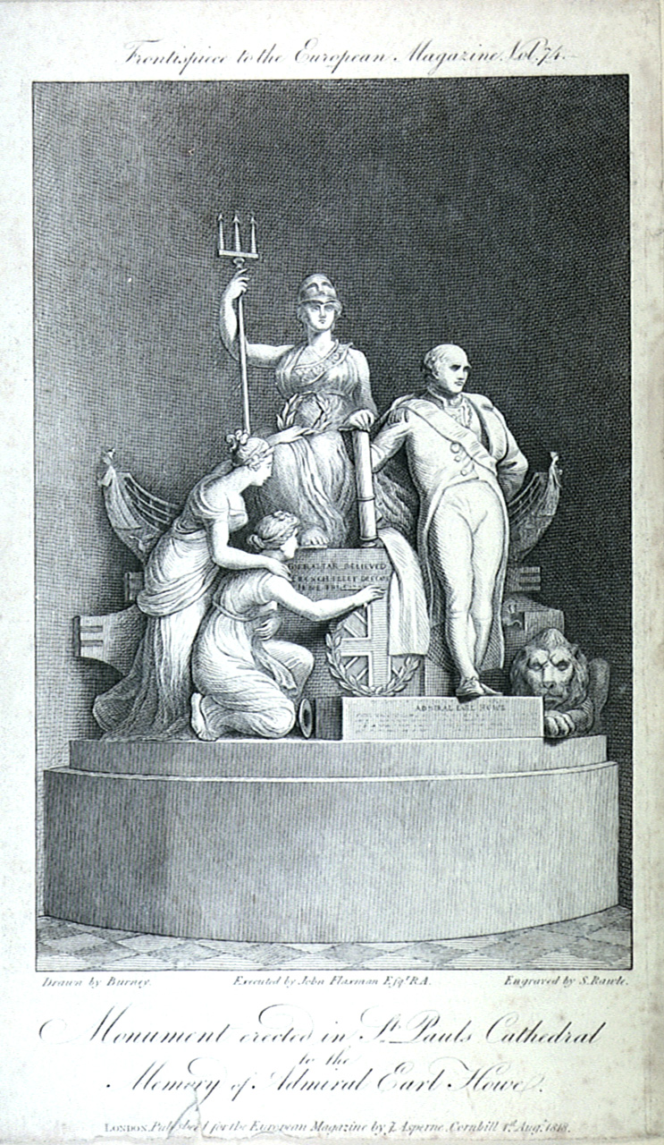 Monument erected in St Paul's Cathedral to the memory of Admiral Earl Howe. Frontispiece to the European Magazine, Vol 74. Admiral Earl Howe earned the dubious nickname 'Black Dick' because he was said never to smile unless a battle was abo