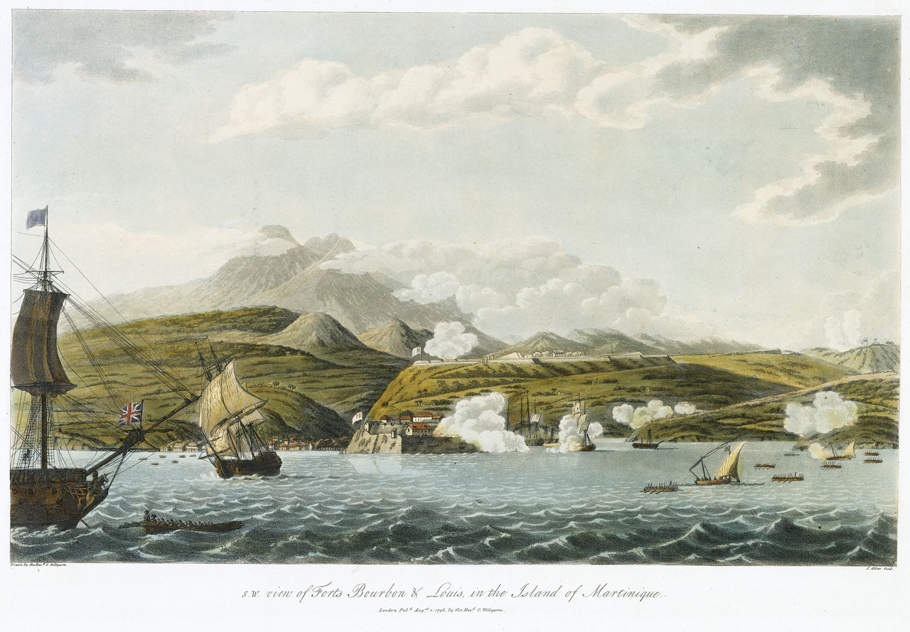 S.W. View of Forts Bourbon & Louis in the Island of Martinique, 5 Feb - 22 Mar 1794. Hand-coloured.; Plate No.4.