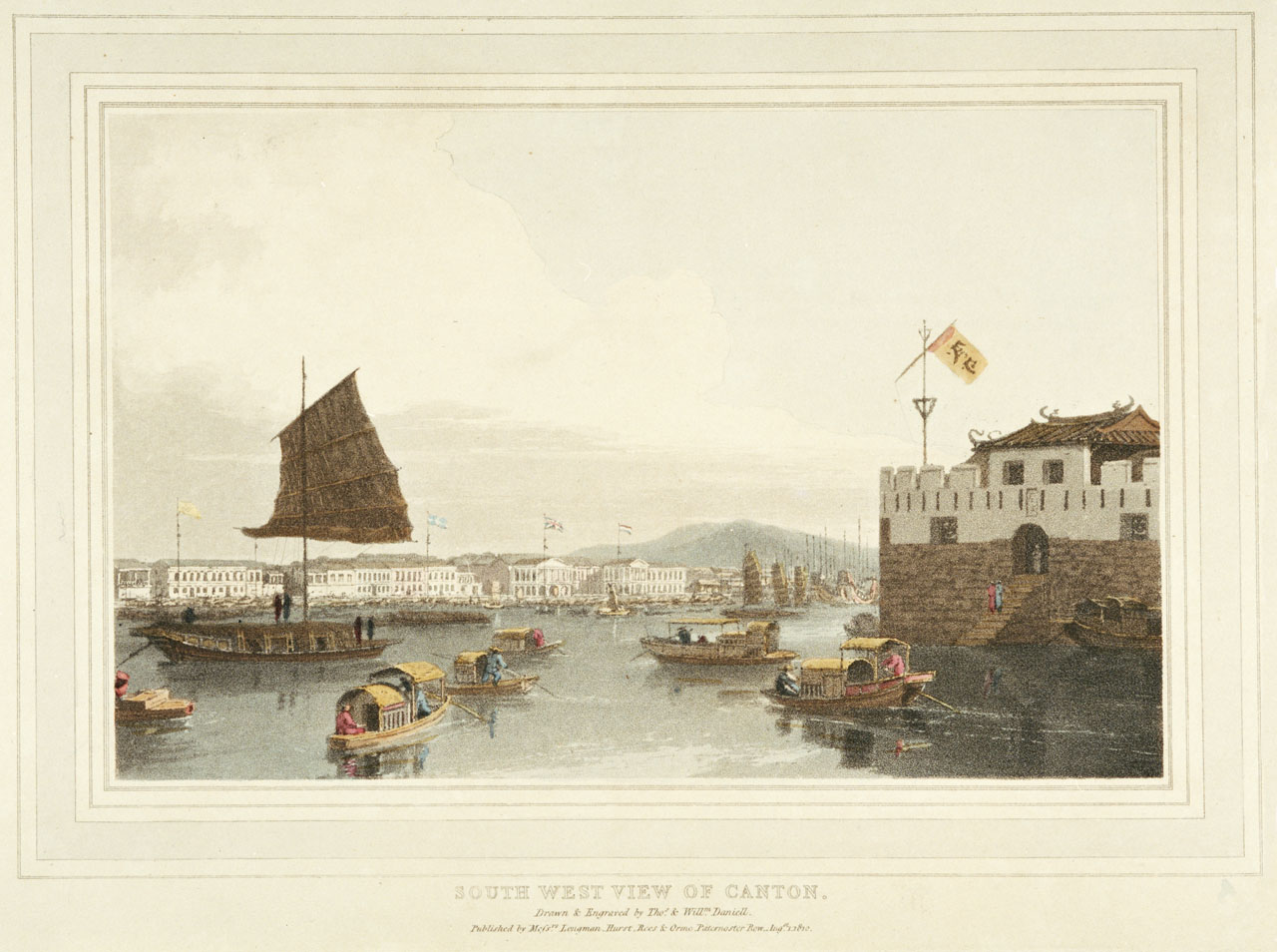 South West View of Canton. Hoe Chu Fou Toe (Dutch Folly Fort) on the Canton River lies east of the foreign factories. The factories can be seen in the background.