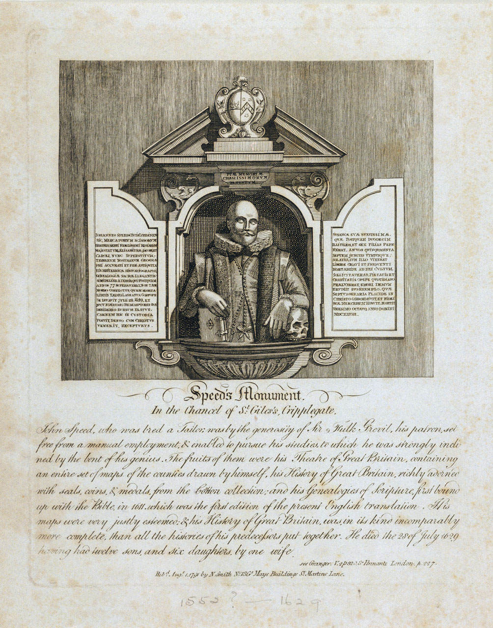 Speed's Monument. In the Chancel of St Giles's, Cripplegate. Text in English below image.