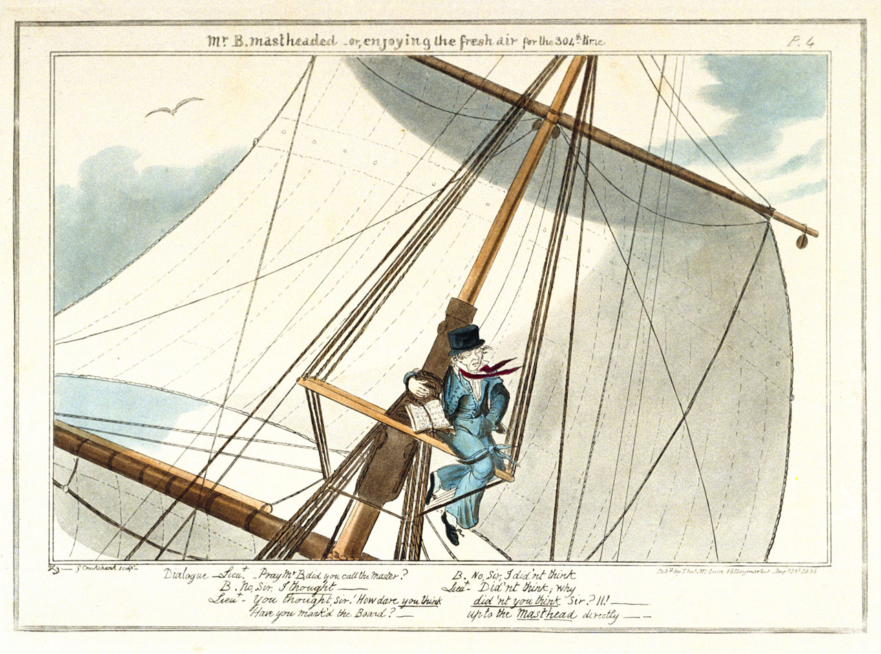 Mr.B. Mastheaded- or, enjoying the fresh air for the 304th time (caricature). Hand-coloured.; Plate No.4.; Text in English below image.