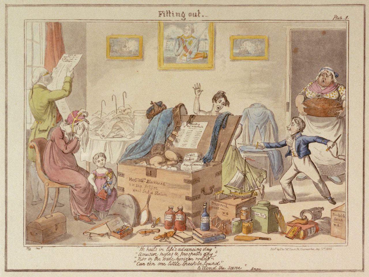 Fitting out- Mast. Willm Blockhead HM ship Hellfire West India Station. (caricature). Hand-coloured.; Plate No.1.; Text in English below image.