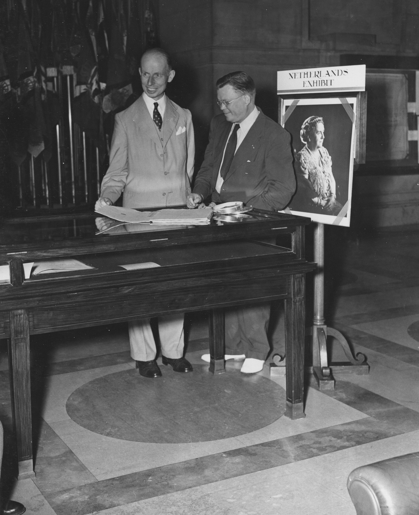 Photograph of the Ambassador of the Netherlands, His Excellency E. N. van Kleffens, and the Archivist of the United States, Dr. Wayne C. Grover, Examining the First Treaty to be Signed by the United S
