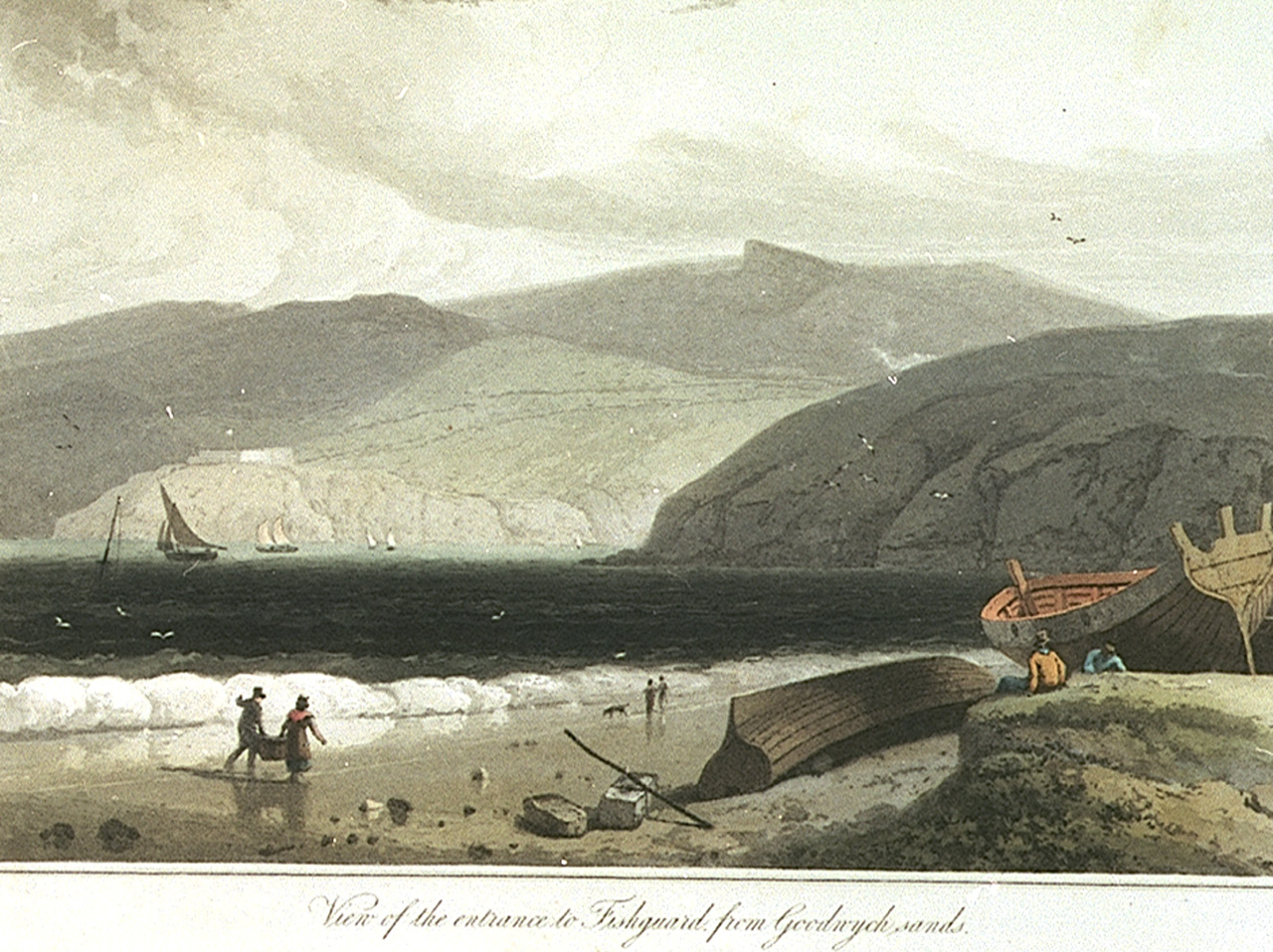 Two gentlemen on a headland, one with a telescope, looking out onto a coastal shipping scene, possibly inscribed ' Sheerness' across left foreground and with inscription, 'Published by H. Moses Oct.1. 1824.'. Mounted in album with PAE9
