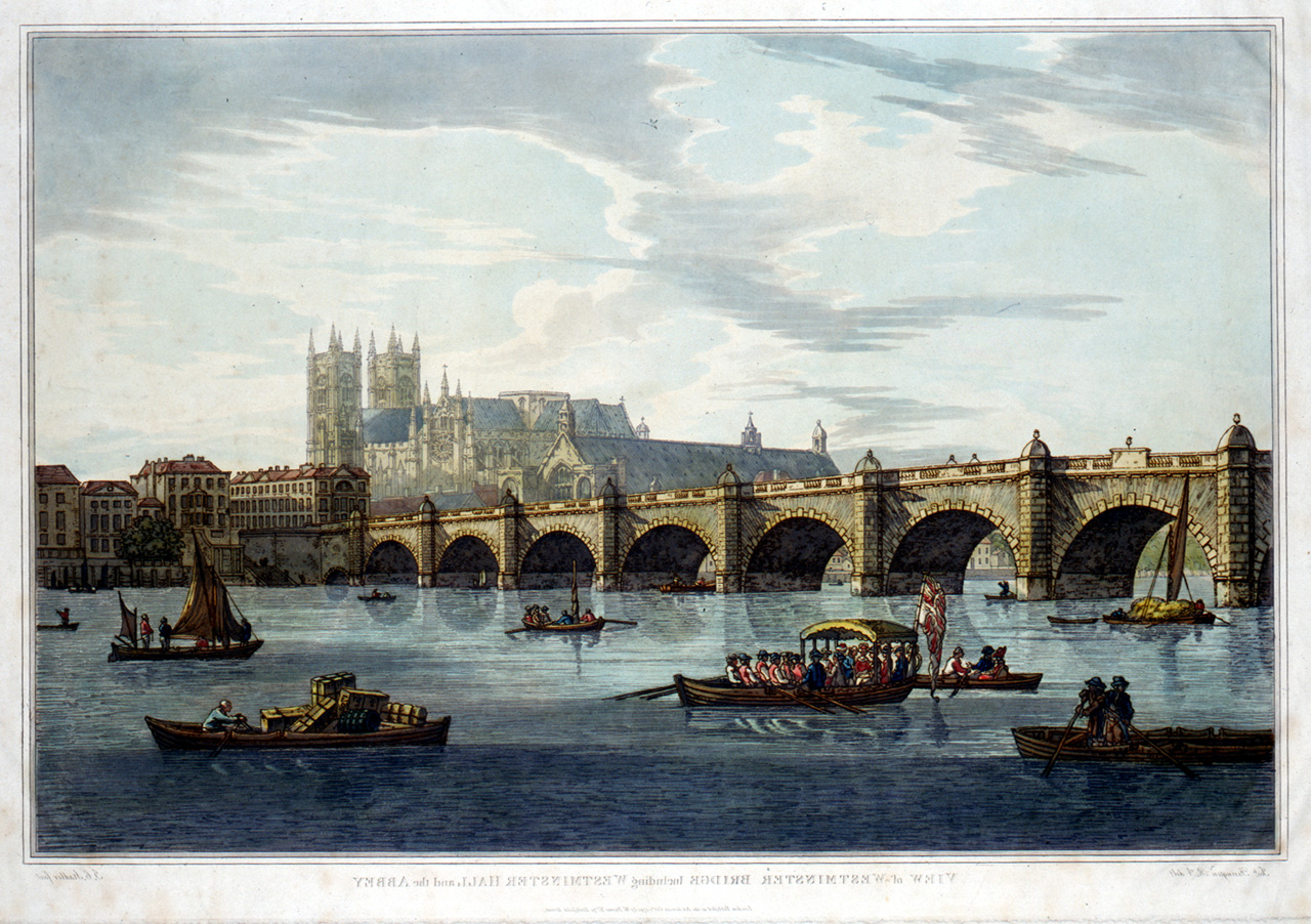 View of Westminster Bridge Including Westminster Hall and the Abbey. Hand-coloured.