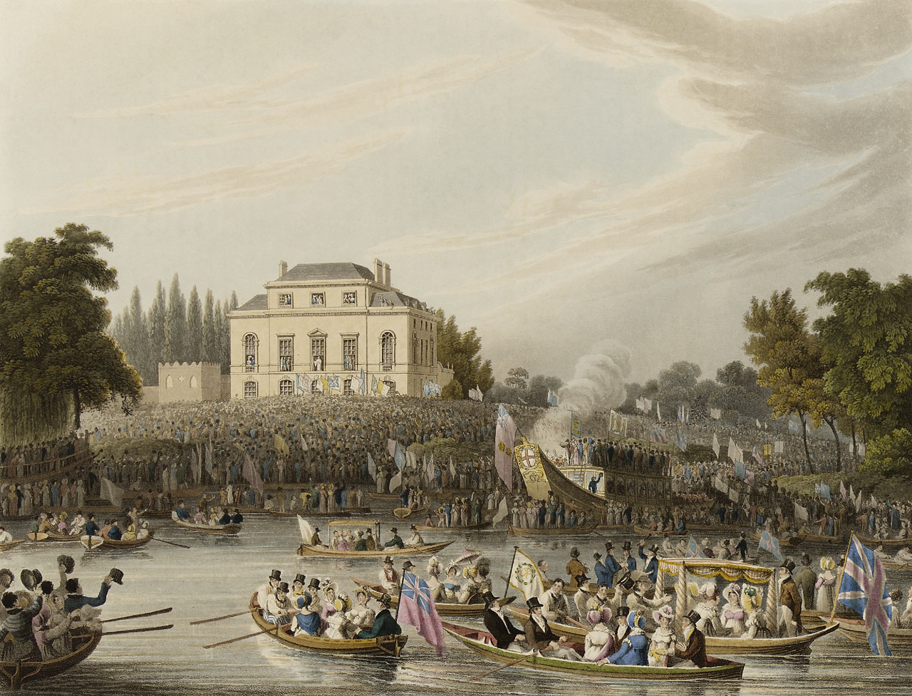 Arrival at Brandenburgh House of the Watermen &c. with an Address to the Queen on the 3d October 1820. The Watermen on the River Thames were responsible for the movement of goods and passengers. The Company of Watermen and Lightermen had been establis
