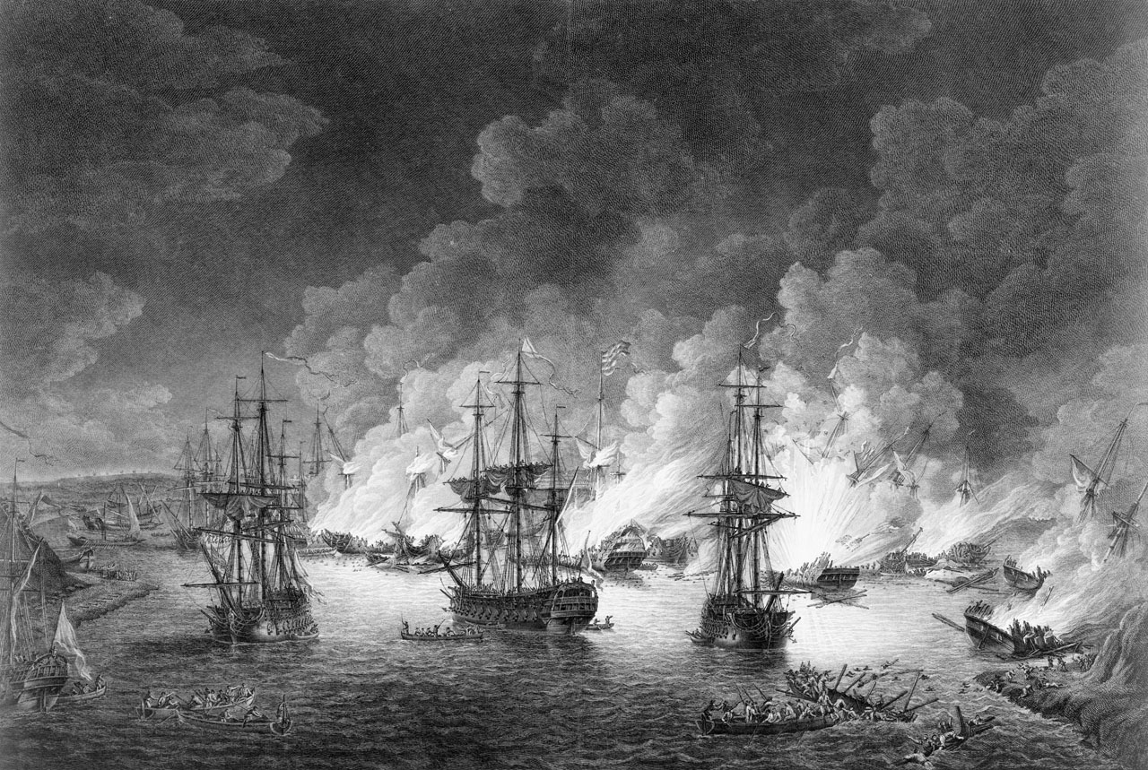 Defeat of the French Fleet by Sr Cloudesley Shovell August 13th 1704. Technique includes engraving.