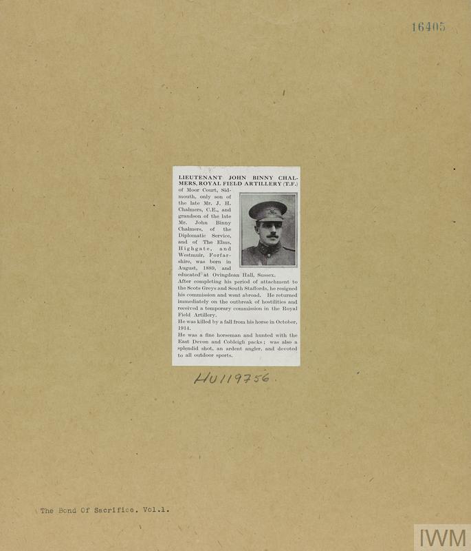 Lieutenant John Binny Chalmers. Unit: 1st Devon Battery, 4th Wessex Brigade, Royal Field Artillery. Death: 01 October 1914 Killed by a fall from his horse United Kingdom
