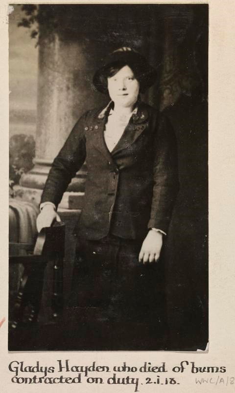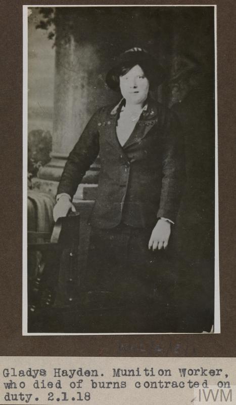 Gladys Hayden, Munitions work. Died of burns contracted on duty 02 January 1918.