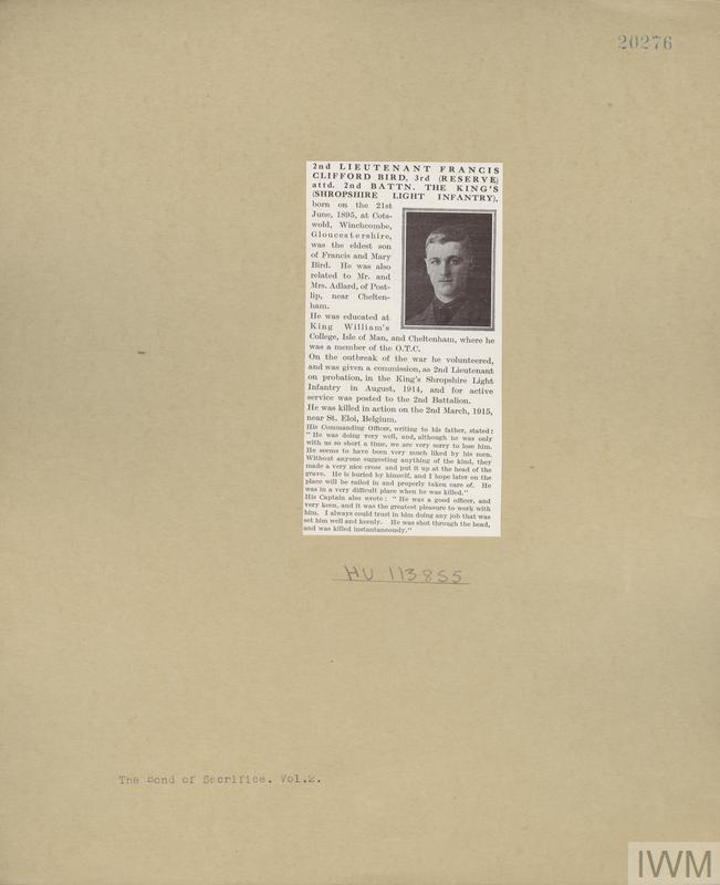 Second Lieutenant Francis Clifford Bird. Unit: 3rd Battalion, attached to 2nd Battalion, King's Shropshire Light Infantry. Death: 02 March 1915 St Eloi Western Front. Son of Francis and Mary Bird, of Cotswold, Winchcombe, Glos.