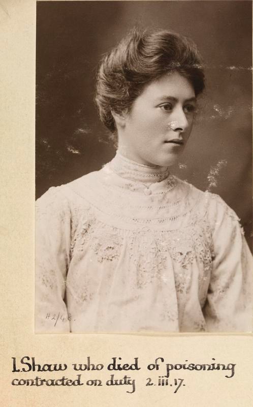Lena Shaw, Voluntary Aid Detachments. Died of poisoning contracted on duty 02 March 1917.