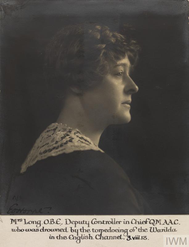 Mrs Violet Long OBE, Queen Mary's Army Auxiliary Corps. Drowned when the Hospital Ship Warlida was torpedoed in the English Channel 02 August 1918.