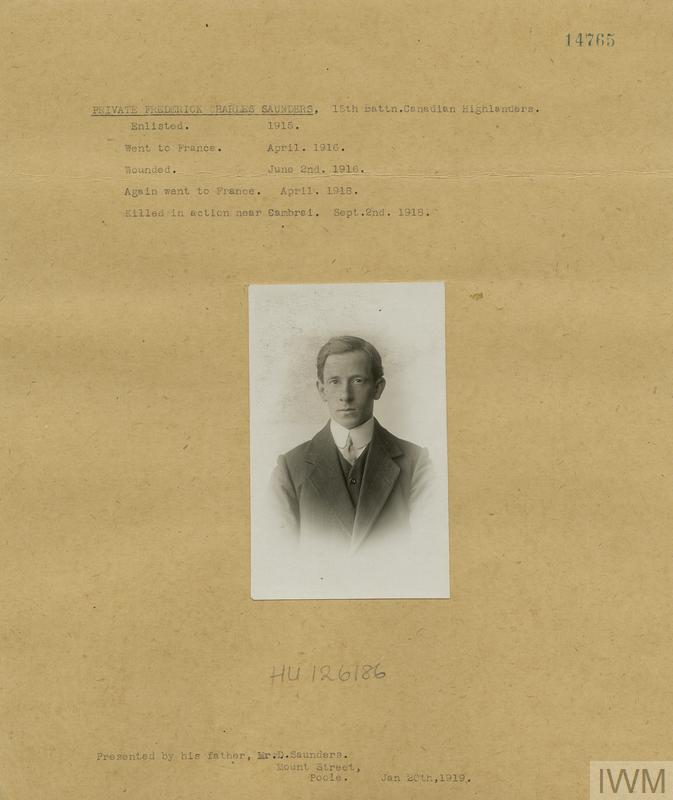 Private Frederick Charles Saunders 192593. Unit: 15th Battalion, Canadian Highlanders, Canadian Infantry (Central Ontario Regiment). Death: 02 September 1918 Killed in action near Cambrai