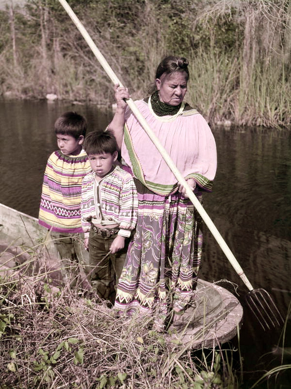 Seminole woman and children gigging frogs near the Tamiami Trail