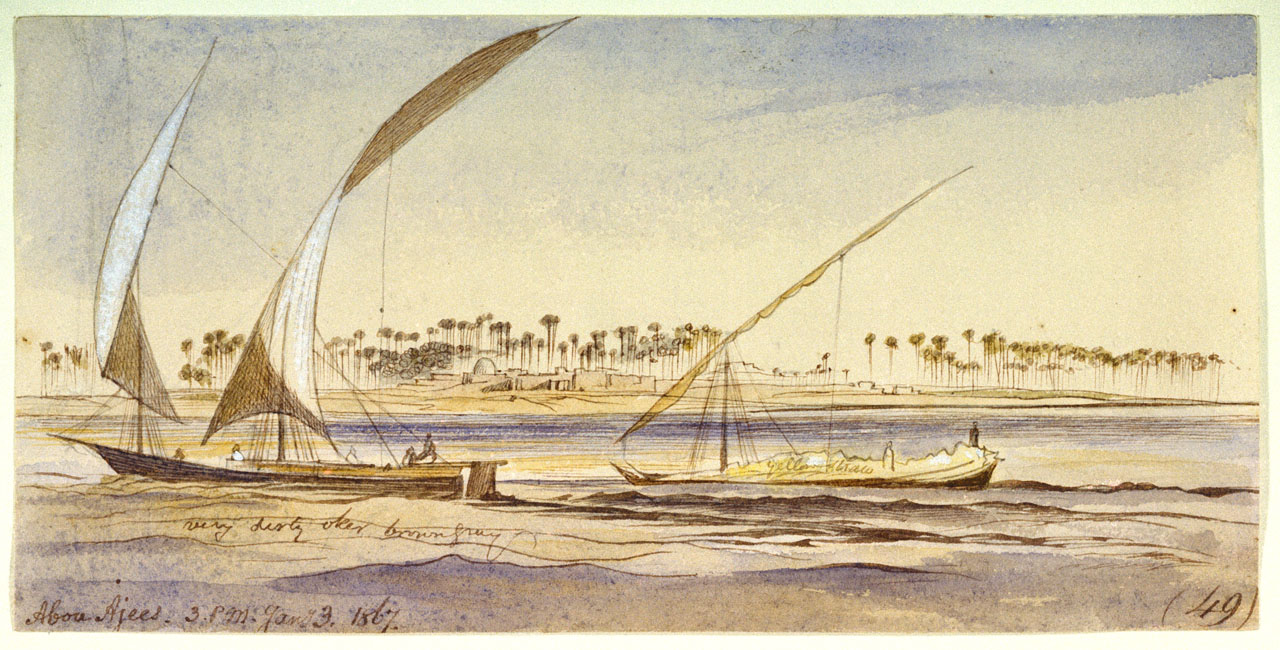 'Abou Ajees. 3.P.M. Jany. 3. 1867 (49)'. This watercolour-view by Edward Lear was taken in the afternoon on 3 January 1867 during the artist’s third visit to Egypt. It shows the banks of the Nile with palm trees and buildings. On the river