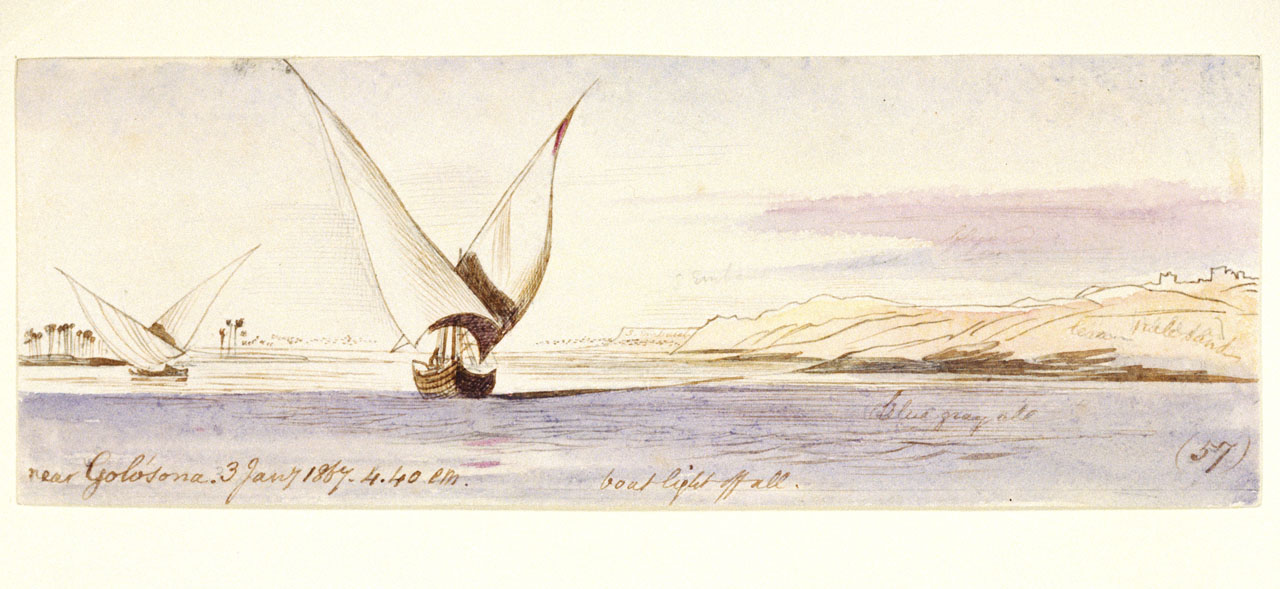 'Near Golosona. 3 Jany 1867. 4.40 P.M. (57)'. This watercolour-view of the Nile near Golosona by Edward Lear was taken in the afternoon on 3 January 1867 during the artist’s third visit to Egypt. It shows a dahabeeyah, a traditional Egypti