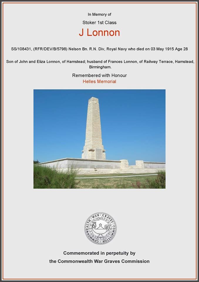 Lieutenant Percy Claude Garnham. Unit: Royal Naval Volunteer Reserve, Nelson Battalion, Royal Naval Division. Death: 3 May 1915, Gallipoli, Dardanelles. Commemorated on the Helles Memorial.