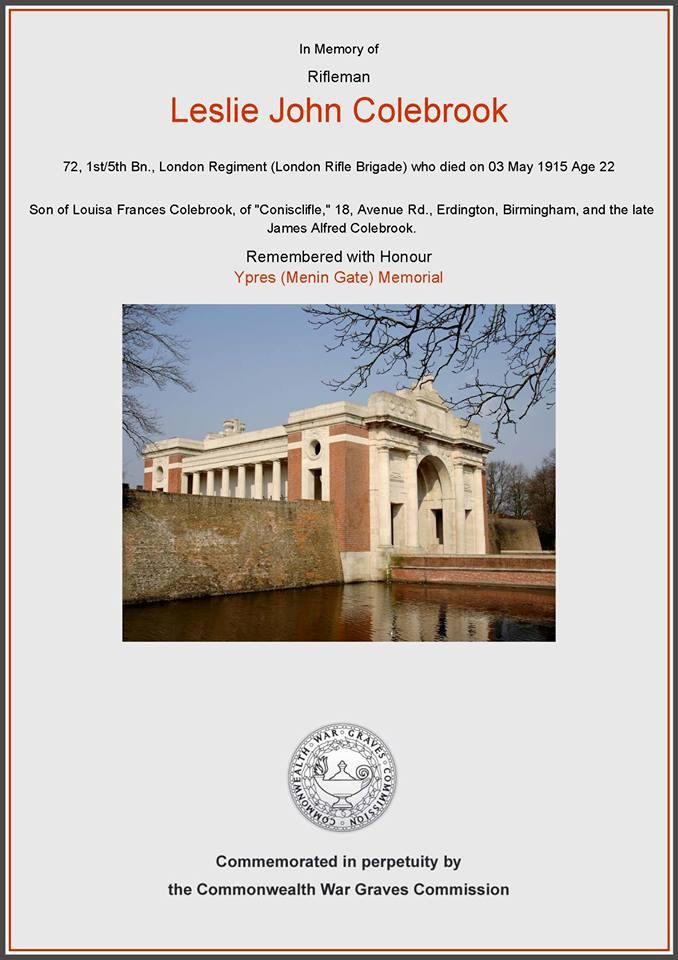 Rifleman Leslie John Colebrook 72, London Regiment (London Rifle Brigade)