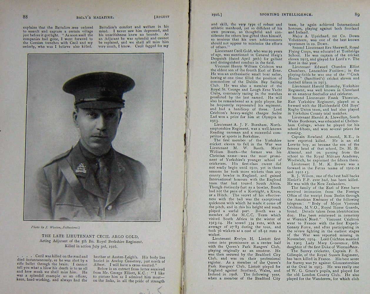 Captain Gerald William Deighton MC. Unit: "D" Company, 7th Battalion, Suffolk Regiment. Death: 3 July 1916, missing in action near Ovillers, Somme, Western Front. Commemorated on the Thiepval Memorial.