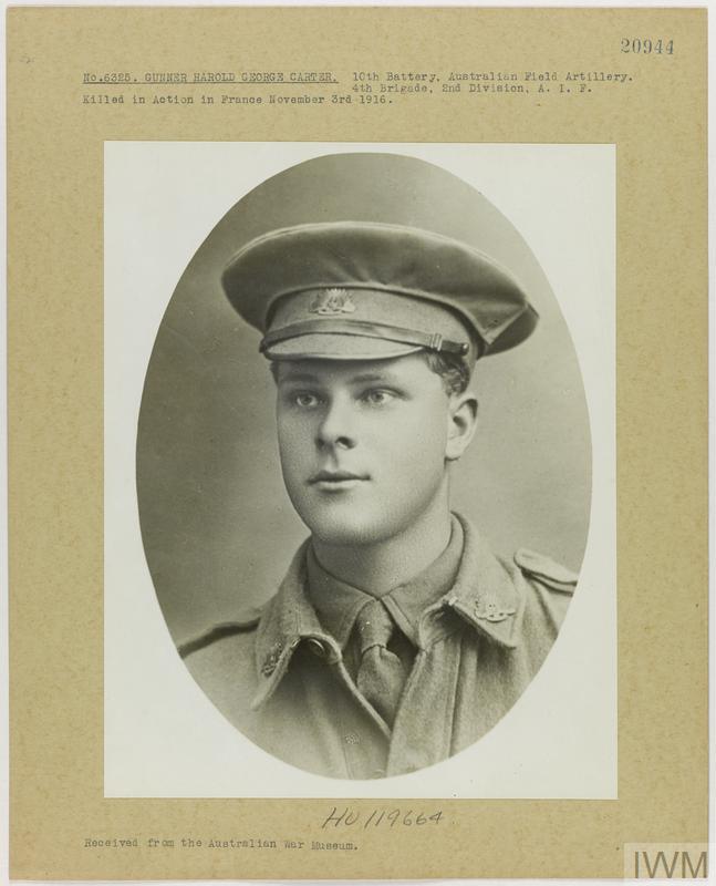 Gunner Harold George Carter 6325. Unit: 10th Battery, Australian Field Artillery, 4th Brigade, 2nd Division, Australian Imperial Force. Death: 03 November 1916 Killed in action Western Front
