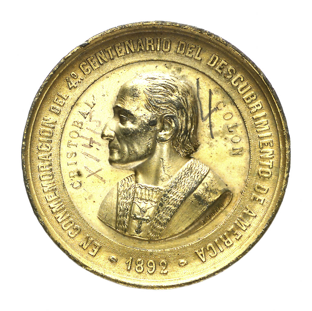 Medal commemorating the 4th centenary of the discovery of America, 1892. Medal commemorating the fourth centenary of the discovery of America, 1892.  Obverse: Bust of the discoverer Christopher Columbus (1451-1506) with short hair, wearing a fur-lined clo