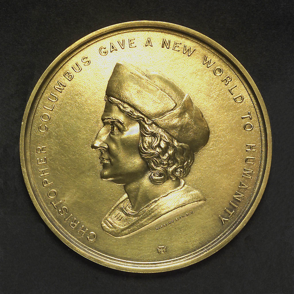 Medal commemorating the 4th centenary of the discovery of America, 1892. Medal commemorating the fourth centenary of the discovery of America, 1892.  Obverse: Bust of Christopher Columbus (1451-1506), (left), wearing a cap over long hair; open neck. Legen