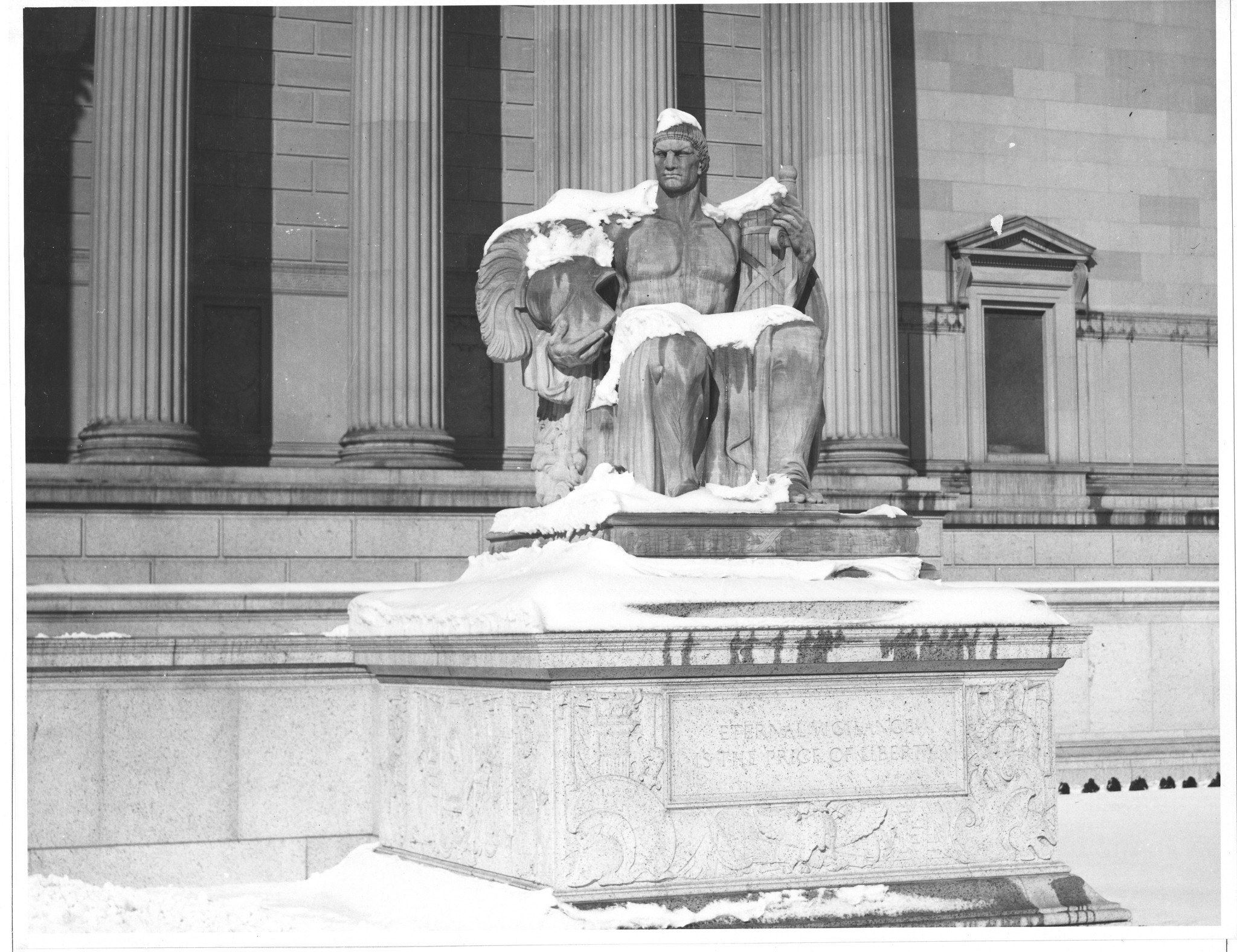 Photograph of the Female Statue, Heritage of the Past, in the Snow near the Constitution Avenue Entrance to the National Archives Building, 01/04/1936