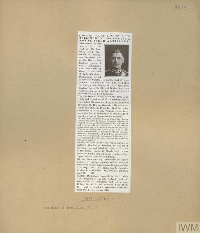 Captain Roger Charles Noel Bellingham MID. Unit: 37th Battery, Royal Field Artillery. Death: 04 March 1915 near Ypres Western Front