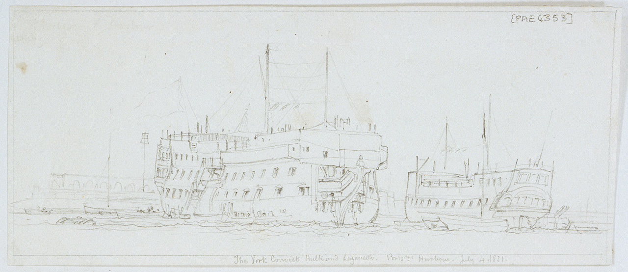 The York Convict Hulk in Portsmouth Harbour with another hulk beyond. This drawing is inscribed by the artist 'The York Convict Hulk and lazaretto, Portsmouth Harbour, July 4 1831'. The further inscription on the mount stating it is from the col