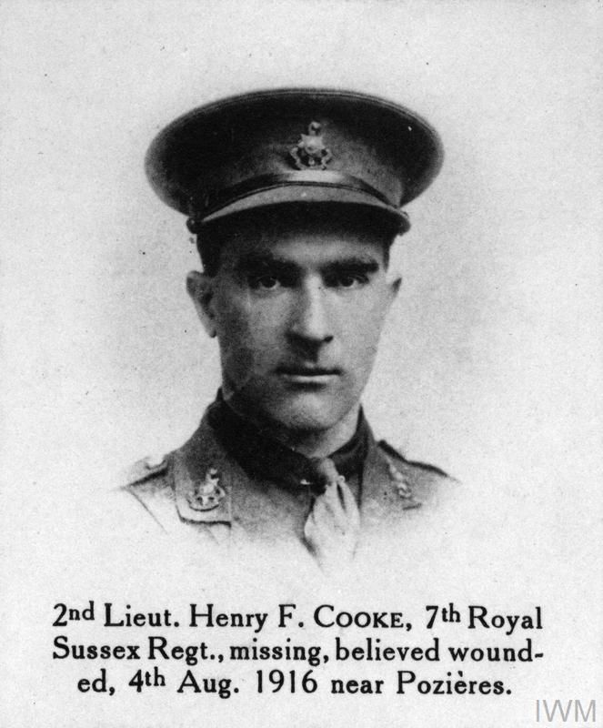 Second Lieutenant Henry Frederick Cooke. Unit: 7th Battalion, Royal Sussex Regiment. Death: 4 August 1916, missing in action, Pozieres, Somme, Western Front. Commemorated on the Thiepval Memorial.