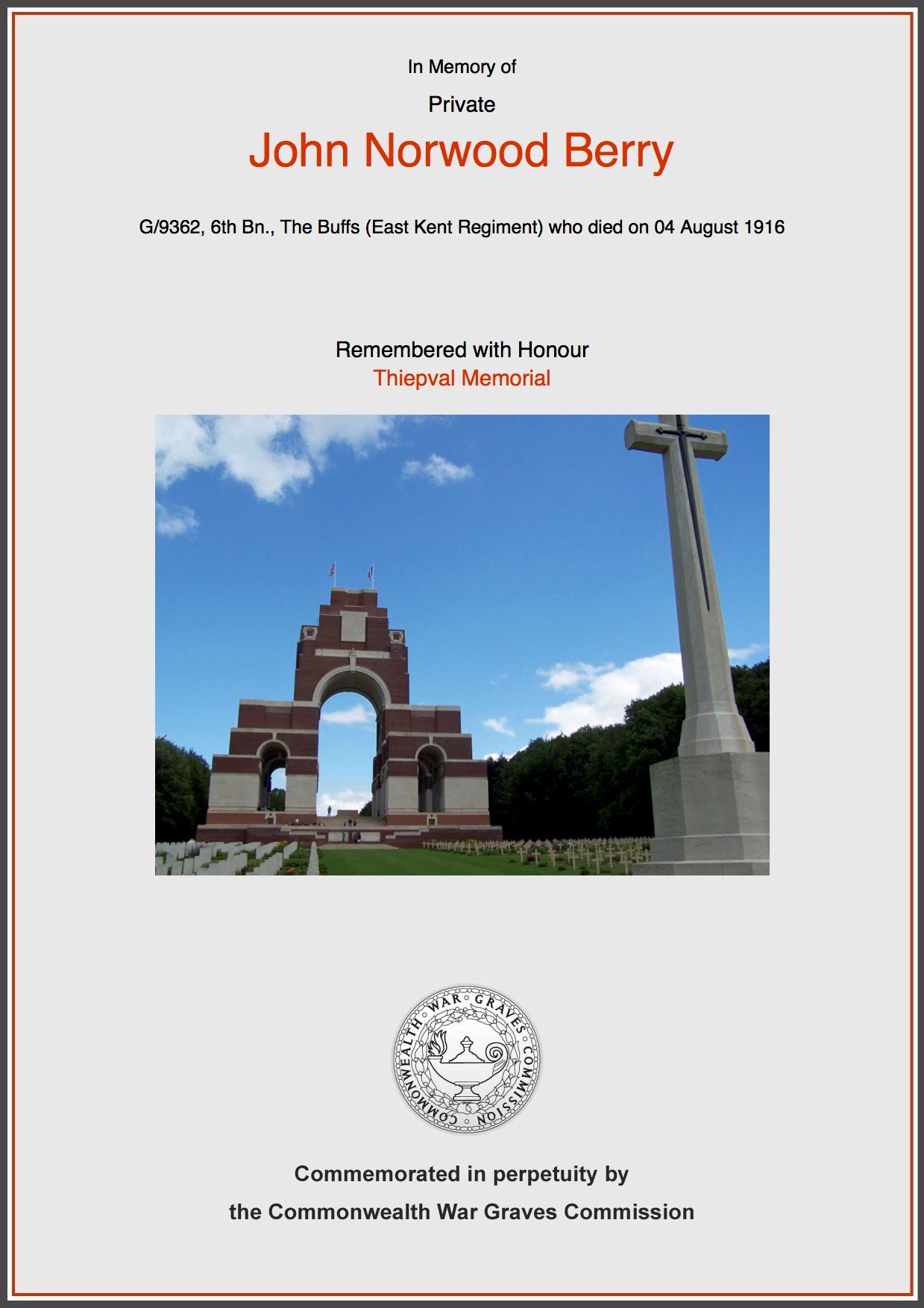Private Benjamin James Hearn 27844. Unit: 3rd Section, 13th Platoon, "D" Company, 9th Battalion, Royal Fusiliers. Death: 4 August 1916, wounded and missing in action, Somme, Western Front. Commemorated on the Thiepval Memorial.