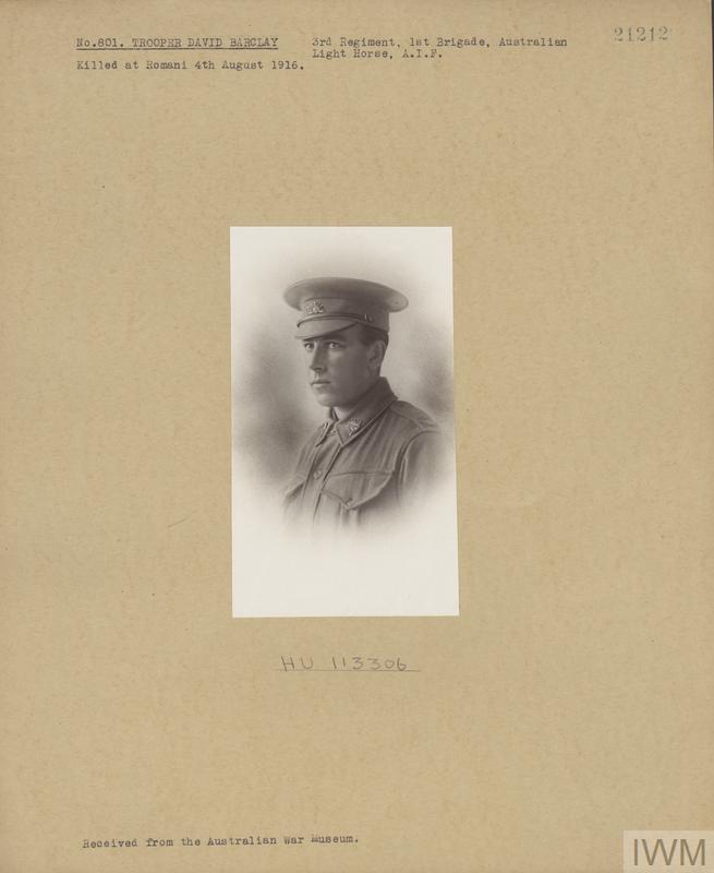 Trooper David Barclay 801. Unit: 3rd Australian Light Horse Regiment, 1st Brigade, Australian Imperial Force. Death: 4 August 1916, El Romani, Egypt.