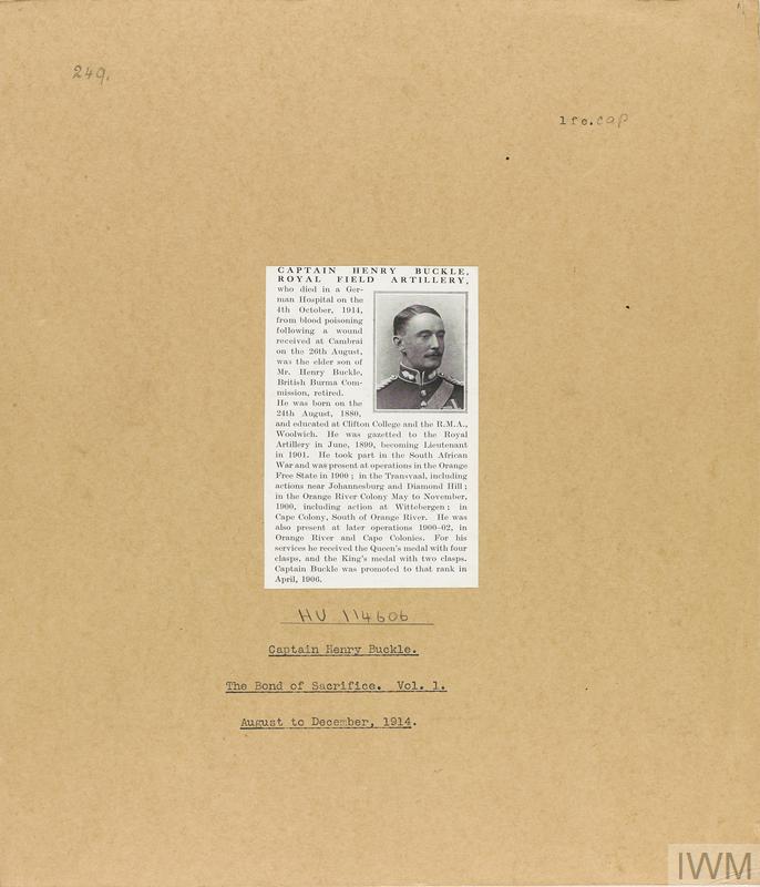 Captain Henry Buckle. Unit: Royal Field Artillery. Death: 04 October 1914 From wounds received 26 August Cambrai Western Front buried in Cologne, Germany as POW. Son of Henry Buckle.