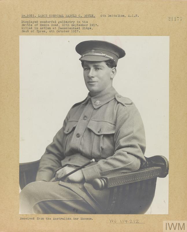 Lance Corporal Harold Charles Boyle 5051. Unit: 6th Battalion, Australian Infantry, Australian Imperial Force. Death: 04 October 1914 Passchendaele Western Front. Son of John and Elizabeth Boyle, of "Verdantvale," North Boort, Victoria.